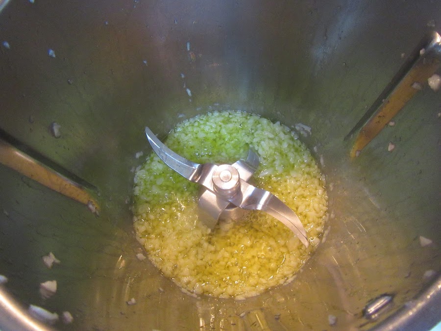 2- Picar los ajos, 5 seg. vel.5. Bajar restos hacia las cuchillas, añadir el aceite y sofreír 5 min. Varoma, vel.cuchara.