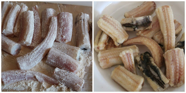 Mientras, troceamos la Moixina, la pasamos por harina y la sellamos en aceite caliente.