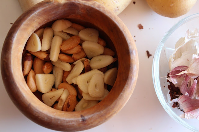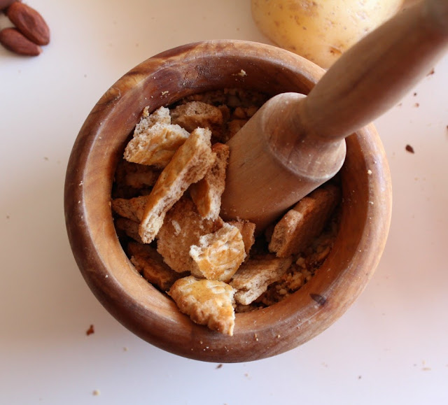 Hacemos una picada con los ajos, las almendras y las galletas