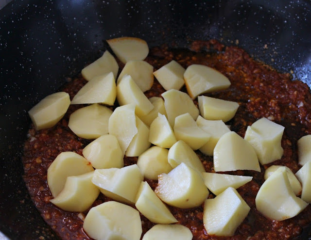 Pelamos las patatas y las "rompemos" en trozos.