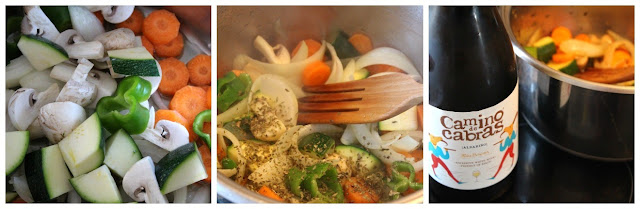 Añadimos el vino tinto y el caldo de verduras, hasta cubrir.