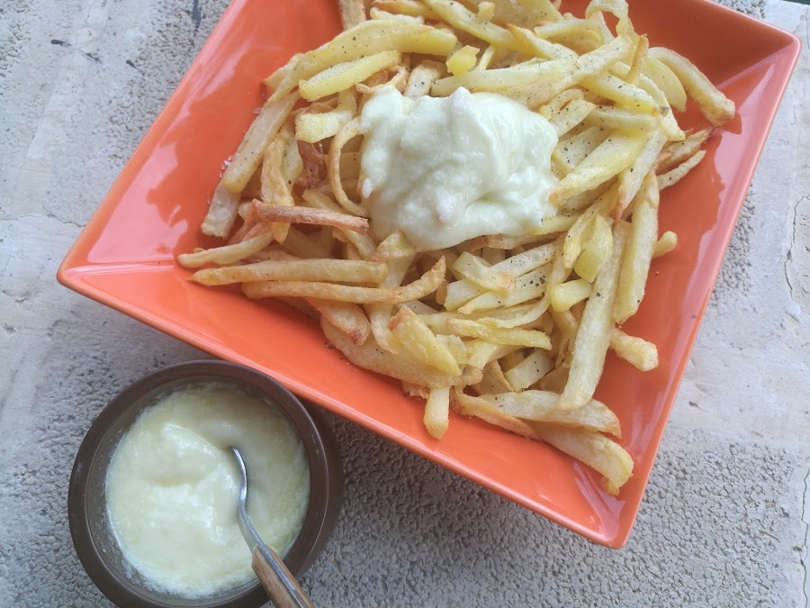 Aunque en la receta medieval aconsejan acompañarla de carnes a la brasa, lo dejo para más adelante...me inicié con unas patatas fritas....que delicicia, que salsa más rica!! no entiendo porqué no ha seguido haciéndose, como el allioli...no dejéis de probarla, os va a sorprender!!