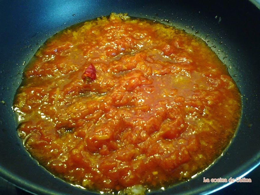 cuando está frita le añadimos el vino y el tomate frito,