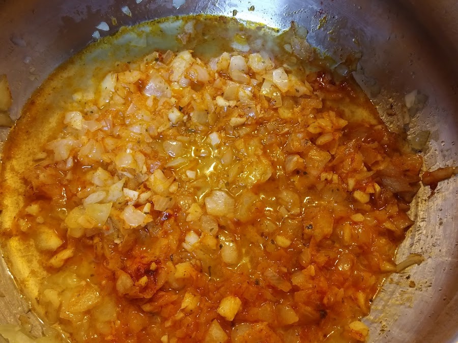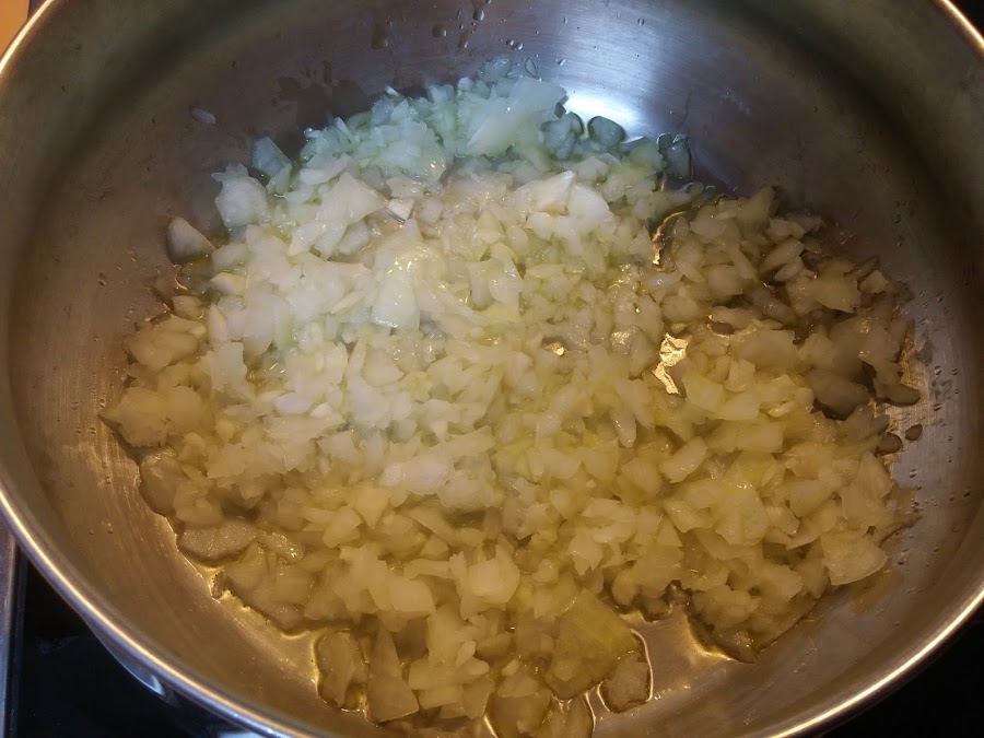 Pelamos y picamos los ajos y la cebolla y los rehogamos en una cazuela con 4 cucharadas de aceite.