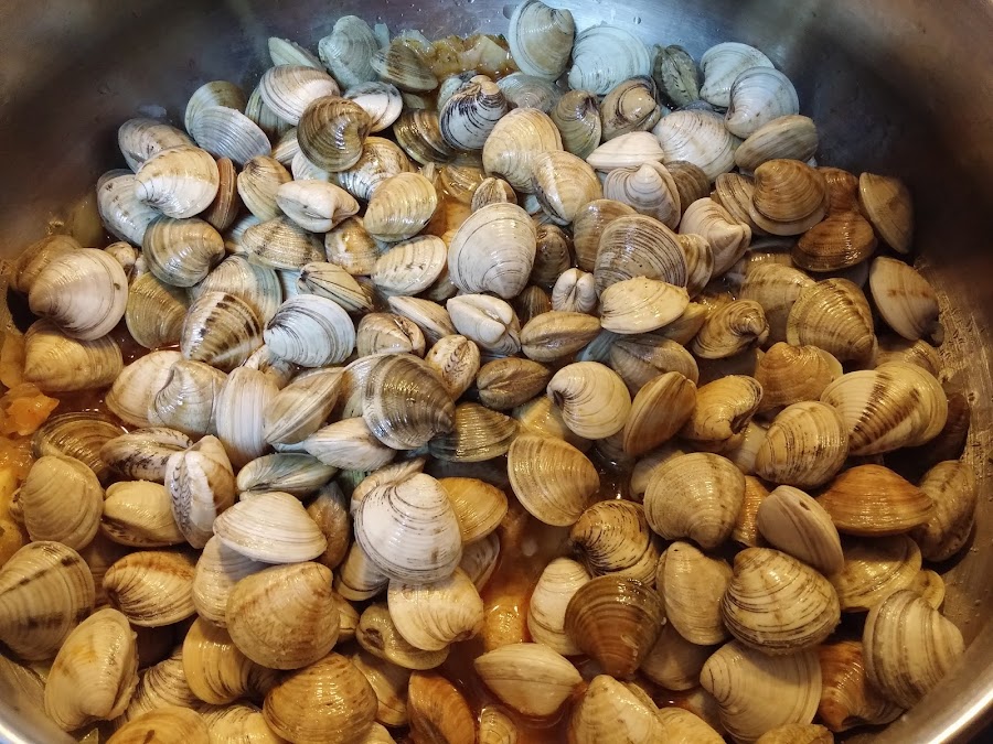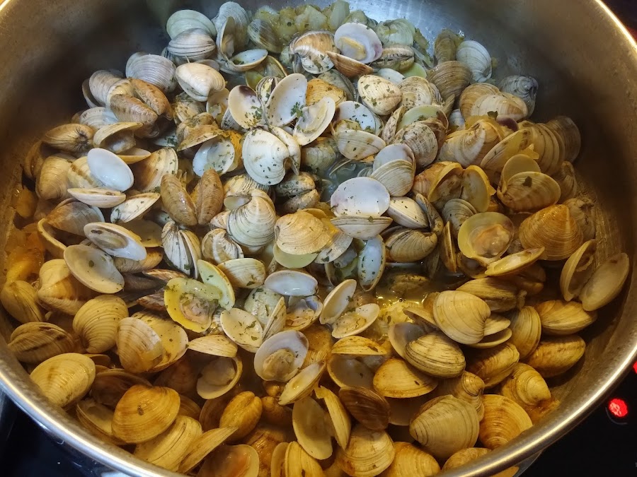 Incorporamos las almejas, ya enjuagadas y escurridas y salamos. Tapamos y dejamos un rato hasta que se abran.