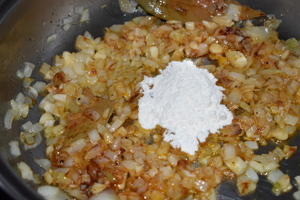 Cuando este la cebolla, añade la harina, remueve que se fría un poco y no sepa a cruda.