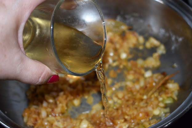 Añade el vino, remueve y deja unos minutos que se evapore y añade también el laurel.