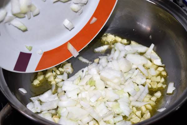 Ponemos una sárten o olla con aceite de oliva virgen, cuando este caliente añadimos los ajos y cuando cojan algo de color añade la cebolla.
