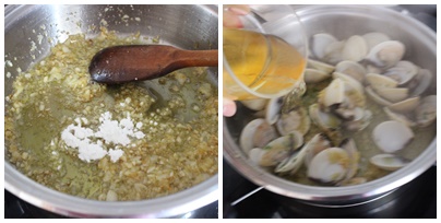 En una cazuela ponemos el aceite y cuando esté caliente añadimos los ajos y la cebolla muy picaditos, cuando estén dorados añadimos la harina y le damos unas vueltas, echamos las almejas y a continuación la sidra, les ponemos sal y pimienta al gusto y el perejil picado y dejamos que hiervan unos minutos para que se evapore el alcohol y se abran las almejas.