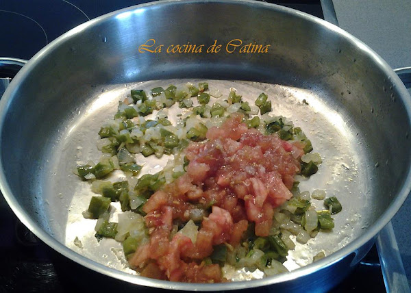 Cuando la cebolla empiece a dorarse, añadimos el tomate cortado a dados pequeños, salpimentamos y dejamos cocer a fuego suave hasta que desaparezca el agua del tomate.