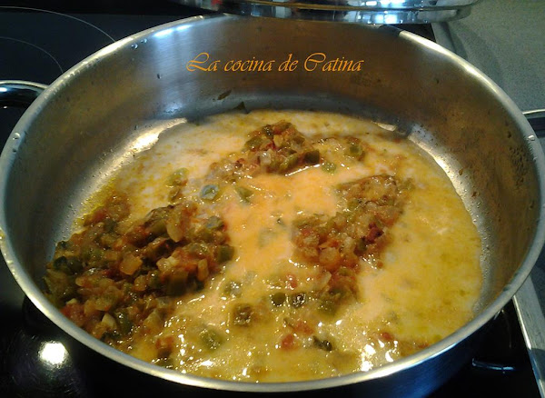 Al sofrito le añadimos la harina que habremos desleído en un poco de agua o vino blanco con un toque de pimentón dulce. Removemos para que se espese.