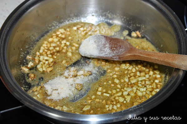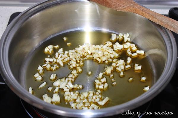En una cazuela ponemos un poco de aceite y freímos los ajos muy picaditos.