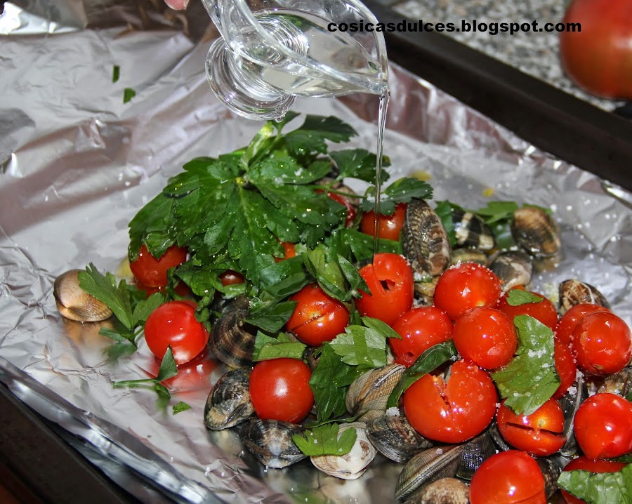 Colocamos un par de pliegos de papel de aluminio y sobre ellos las almejas (bien enjuagadas), los tomatitos un poco estrujados, el perejil, la sal, el aceite y el vino.