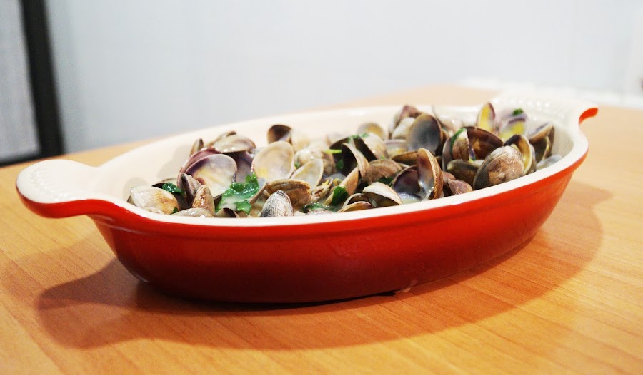 En este caso sólo la hago con aceite, ajo, harina y caldo de pescado pero le podéis añadir un vasito de vino blanco que también queda muy bueno, pero a mi la verdad es que me gusta mas así con las almejas haciéndose en la salsa le da un gustito buenísimo.