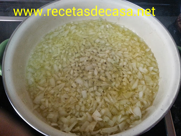 En una sartén con un poco de aceite, sofreímos la cebolla bien picada durante unos tres minutos y añadimos el ajo también bien picado.