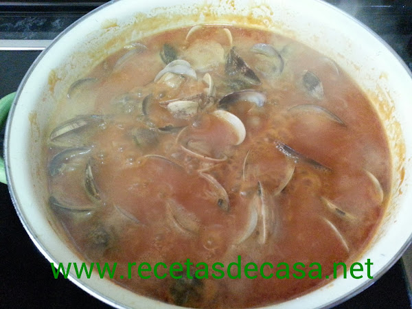 Dejamos cocer unos diez minutos a fuego medio y agregamos las almejas.