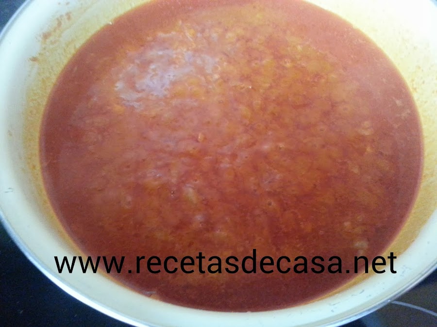 A continuación se añade la salsa de tomate. Rehogamos un poco y añadimos el vino y un vaso de agua.