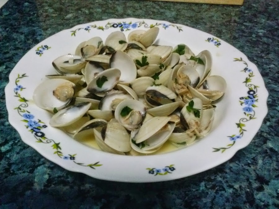 Cuando el aceite esté caliente sofreír los ajos, y seguidamente agregar las almejas previamente lavadas.sofreír un poco y agregar la pimienta el perejil y el vino blanco.
