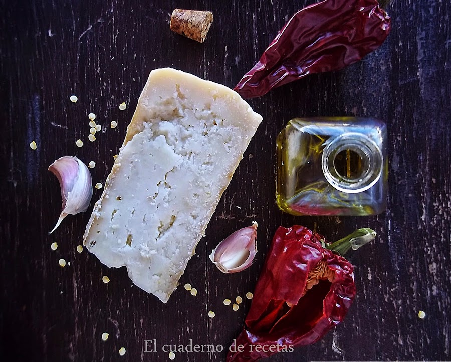 Me gusta hacerlo a mano y con cuatro ingredientes: queso, pimienta seca, aceite, y ajo. Nada más.