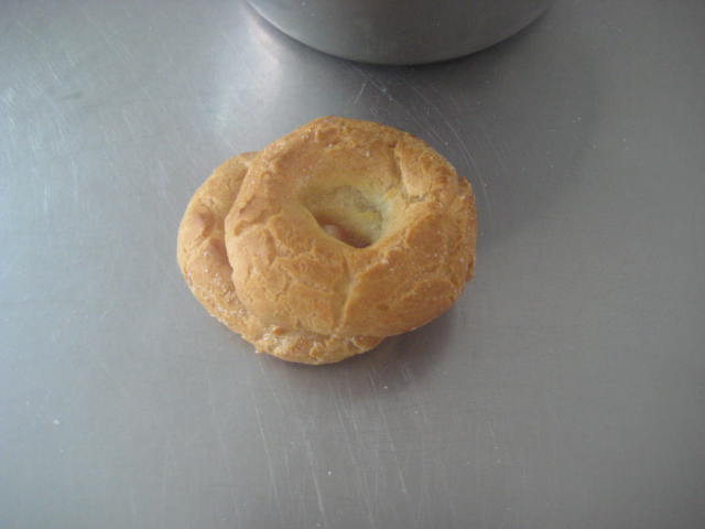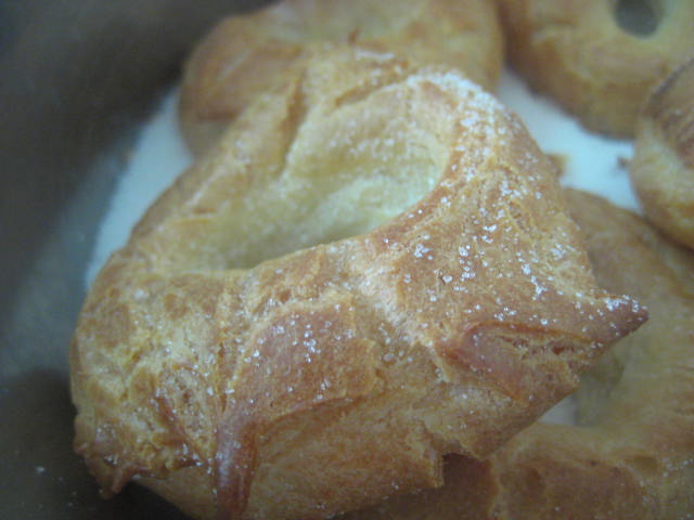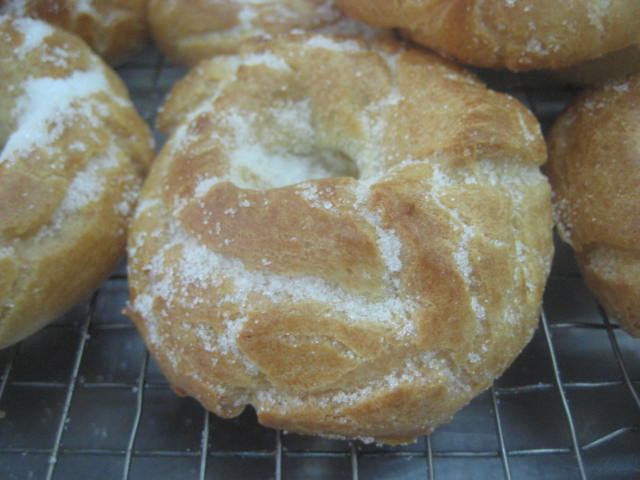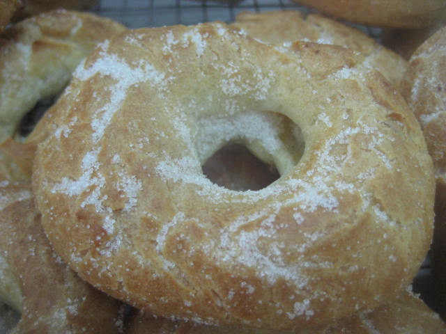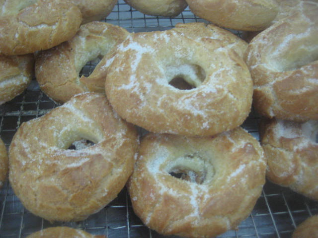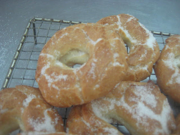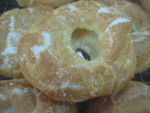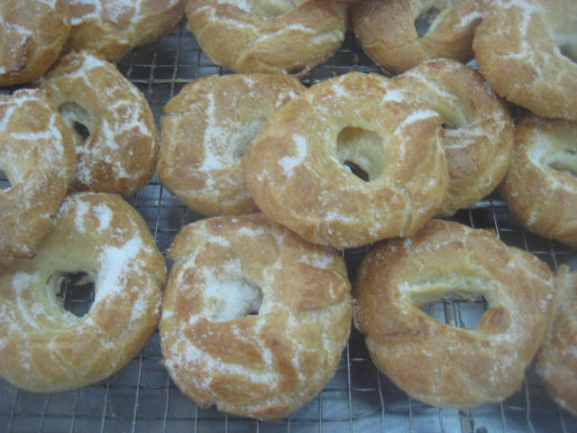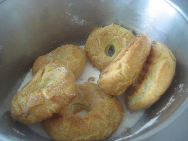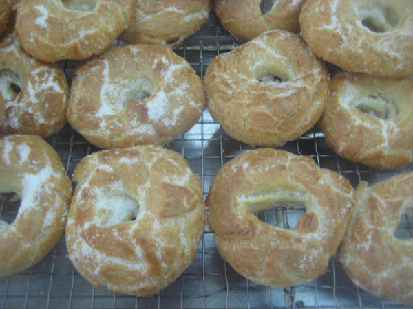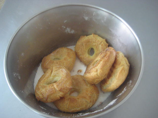 .Preparación: Calentar el agua, la sal, el aceite de girasol y el azúcar. Cuando rompa el hervor añadir de golpe la harina, a la que le habremos agregado el impulsor; mantener a fuego muy suave y trabajar unos minutos hasta que la mezcla esté fina y se desprenda de las paredes del cazo. En este punto retirar del fuego, dejar enfriar unos momentos para evitar que los huevos se nos puedan cuajar al agregarlos. Una vez ha perdido el excesivo calor, agregar los huevos de uno en uno, de manera que hasta que no esté bien incorporado uno no se agrega el siguiente. Dejar reposar la masa 10 minutos y seguidamente con una cuchara poner pociones lo más iguales posibles sobre una bandeja de horno con papel. Una vez puestas todas las porciones, mojar el dedo índice en aceite de girasol y hace un hueco en el centro para formar la rosquilla. Una vez formadas, cocer en el horno a 180º-190º C, hasta que estén doradas y luego mantener 10 minutos con la puerta del horno abierta. Así se secan y no se bajan. Seguidamente pasar por abundante azúcar granillo y dejar enfriar sobre rejilla