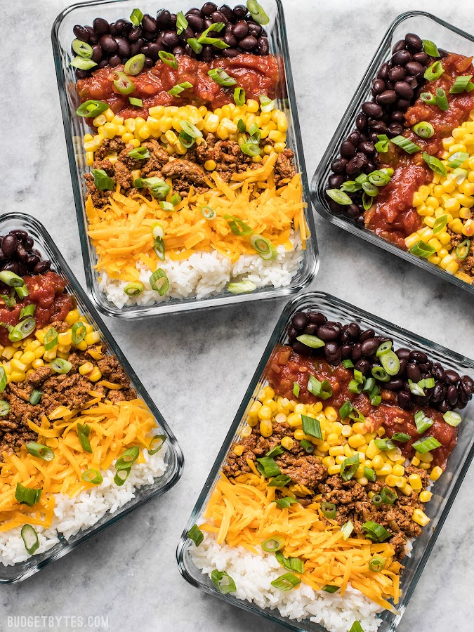 Una vez que el arroz esté terminado, divídelo entre cuatro recipientes. Divida también los seis ingredientes restantes entre los recipientes (carne de taco, maíz, frijoles, queso, salsa y cebollas verdes).