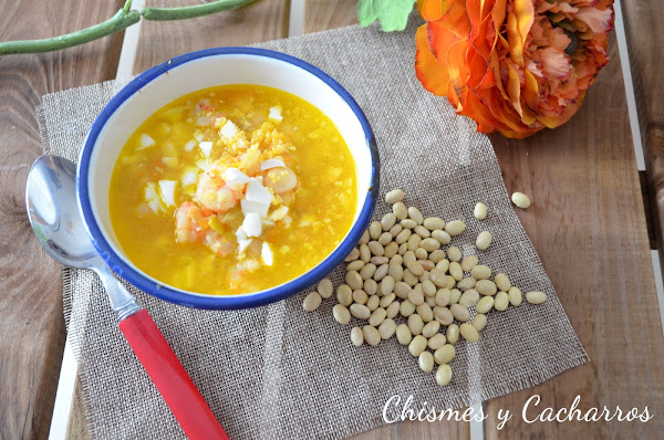 Añadir las alubias, las gambas y dejar cocer un par de minutos. Añadir el huevo picado y servir.