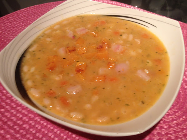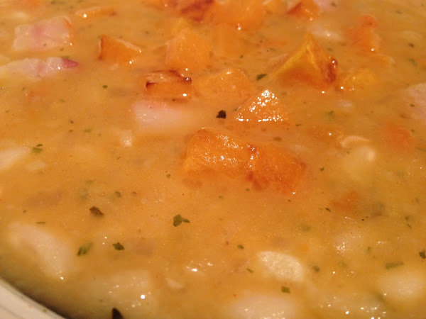 4º - Parte de los dados de calabaza los echamos junto con la panceta a la olla donde están el resto de ingredientes . Nos reservamos unos daditos de calabaza para decorar al final .