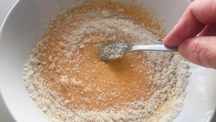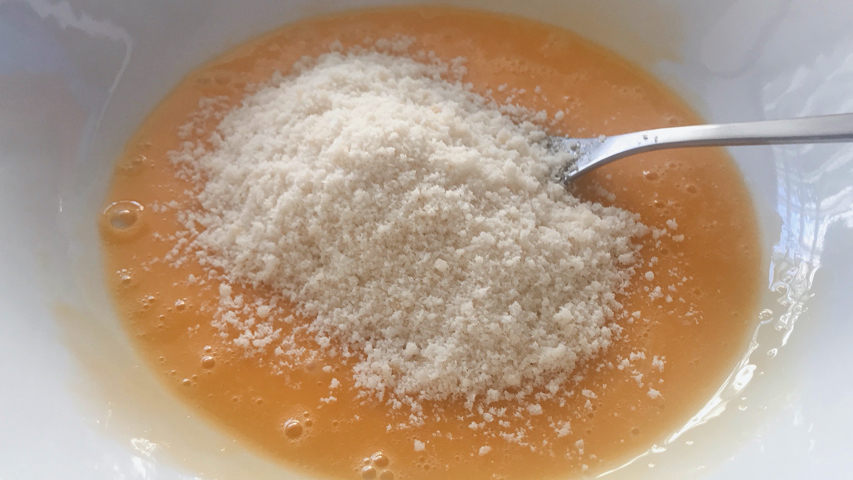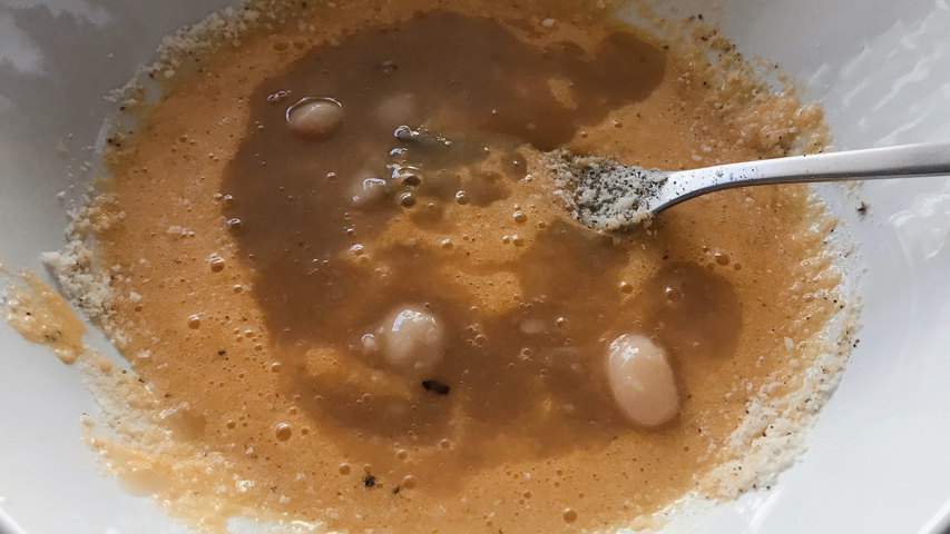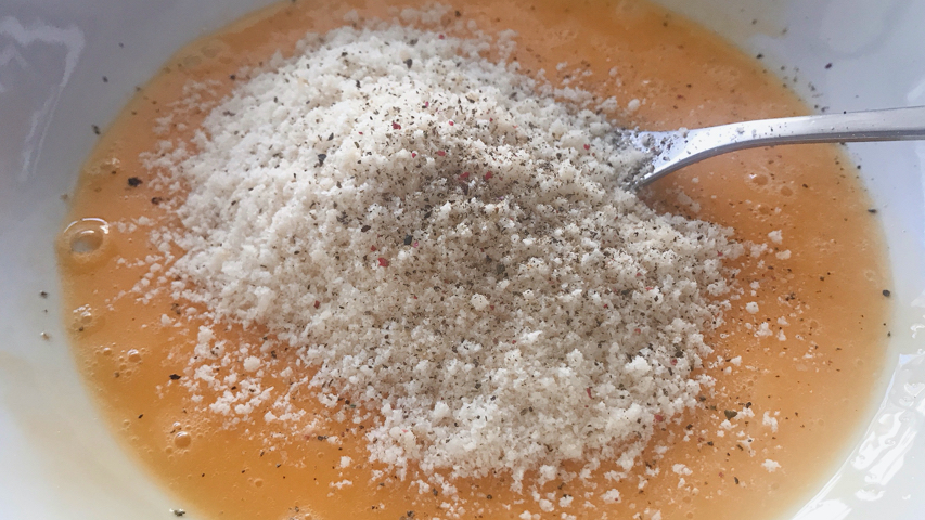 Pon las yemas en un bol, bátelas e incorpora el queso rallado y abundante pimienta negra molida.