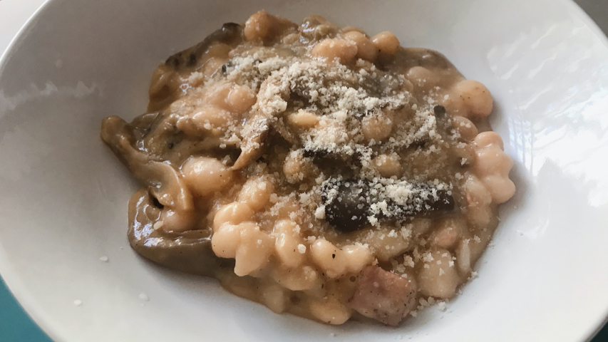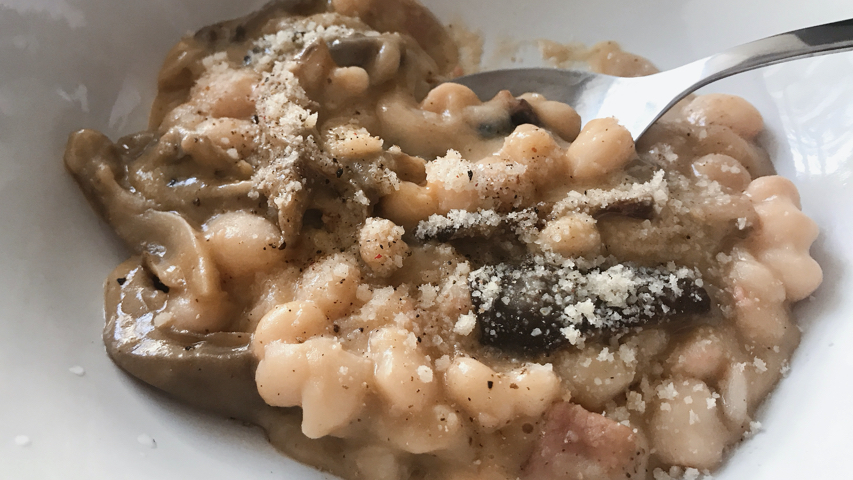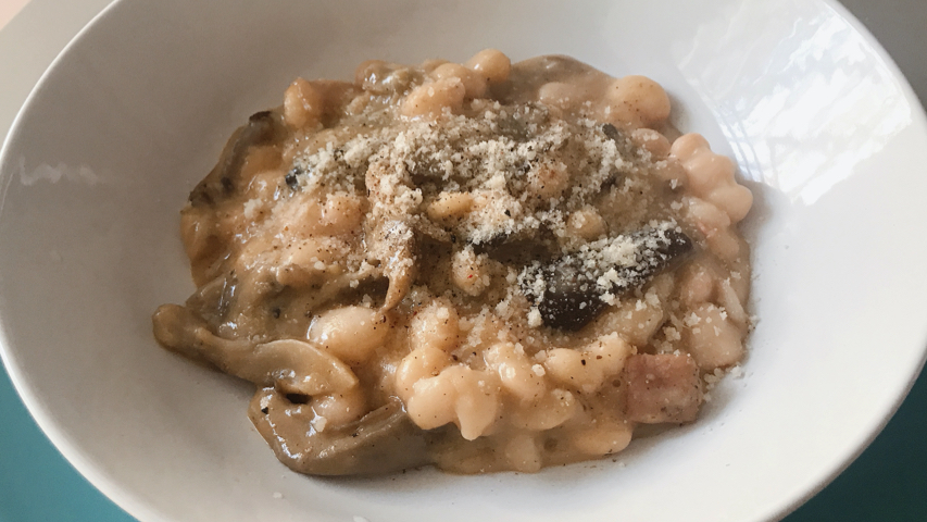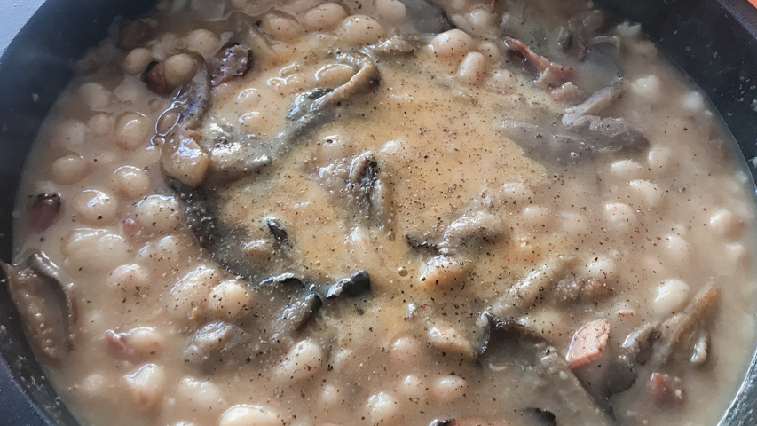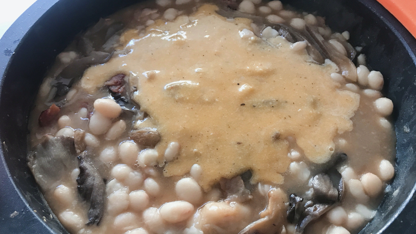 Vierte esta mezcla de yemas con queso y caldo sobre las alubias y mezcla.