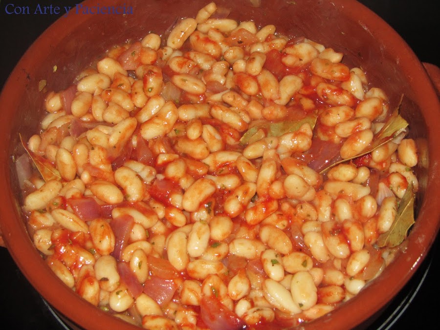 Añadimos las alubias y seguimos cocinando a fuego medio unos 5 minutos.