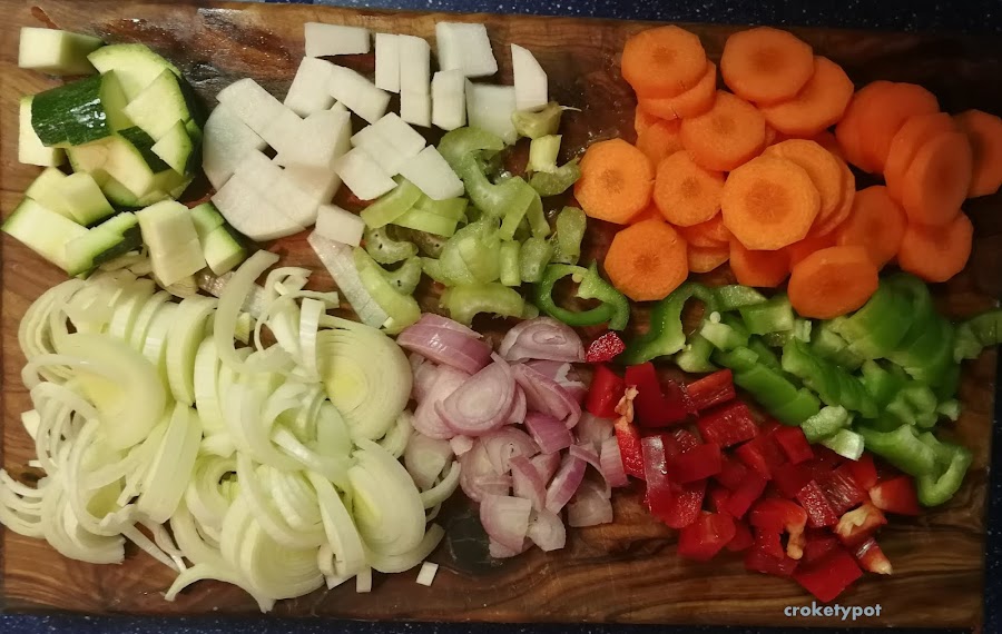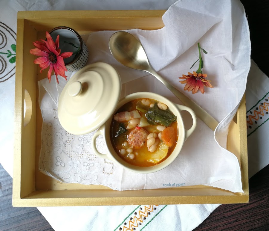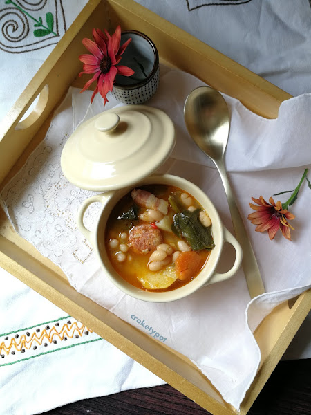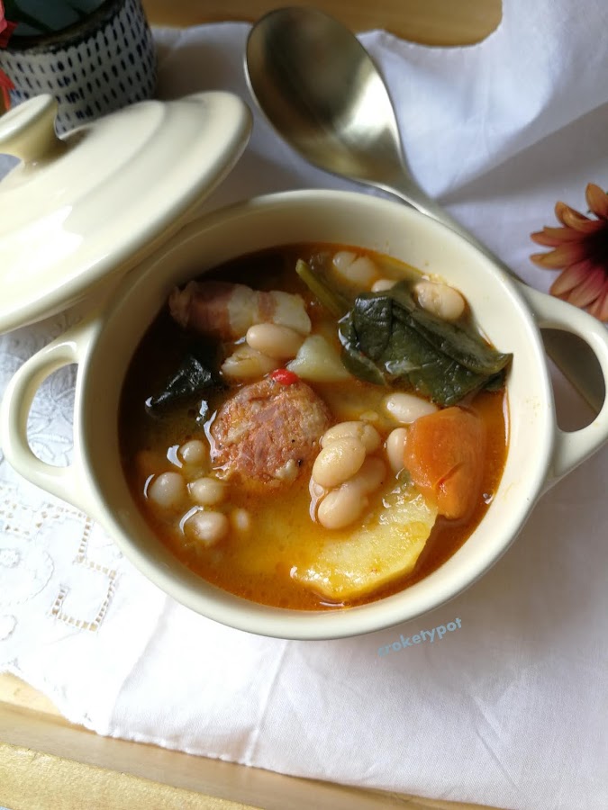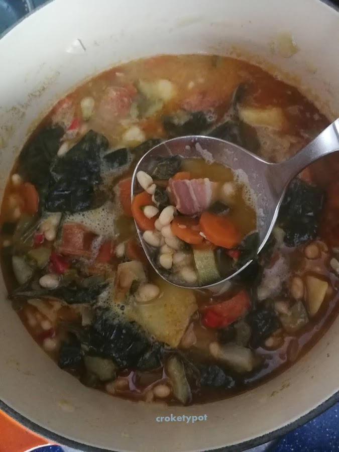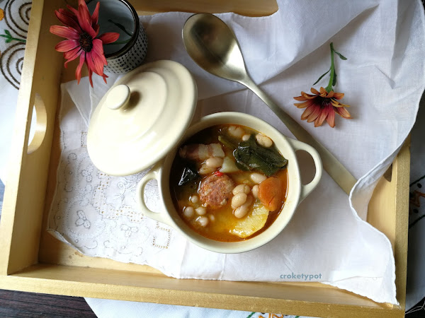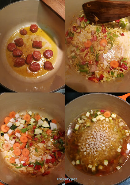 INGREDIENTES: 1 puñado por comensal de alubia arrocina, 2 chorizos oreados, 1 trocito de tocino ahumado (opcional), las verduras que tengas a mano, hoy he puesto, puerro, chalota, pimiento verde, pimiento rojo, ajo, nabo, apio, zanahoria, calabacín y espinacas. Aceite de oliva Aove y sal.