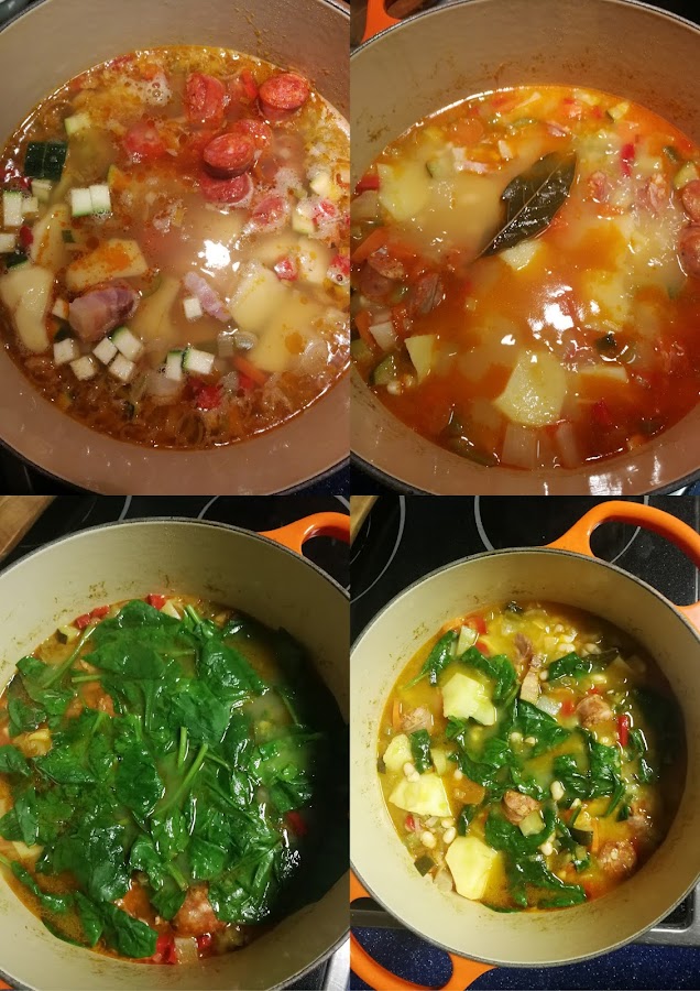 Cuando lleve una hora añadimos las patatas en cascos, el chorizo, unas tiras de tocino ahumado y un puñado de espinacas.