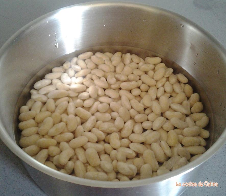 Poner las alubias a remojo la noche anterior. Escurrirlas y ponerlas en una cacerola cubiertas de agua fría.