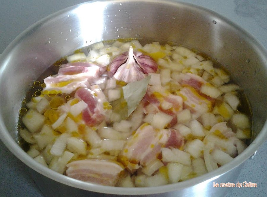 Picar las cebollas en juliana, echarlas sobre las alubias con el tocino troceado, el aceite y la cabeza de ajos.