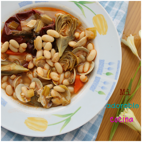 En una olla con aceite hacemos un sofrito con el puerro,sal ,ñoras, tomate y pimentón. Cubrimos de agua, cuando hierva añadímos los alcauciles, patatas, alubias y zanahoria. Tapamos la olla dejando cocer. Por último añadimos las almejas. Cuando abran las almejas apagamos el fuego. Una comida muy rápida de hacer que a todos nos gusta, si no probar y me contáis!