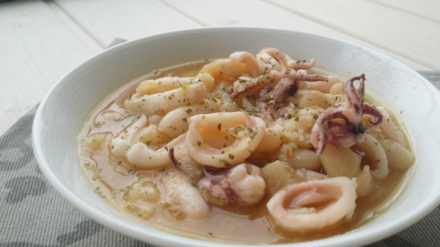 Como estos calamarcitos tan tiernos que me encontré el otro día en el mercado, ¿puede haber algo más delicioso? Y sencillo, señores, que esto te lo puedes llevar al trabajo en un taper, que se pueden cocer las alubias en casa, o usar alubias de bote...