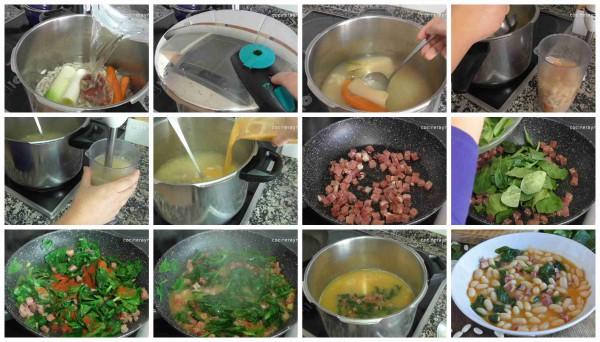 Echamos las espinacas junto con el jamón a la cazuela de las alubias y dejamos que de un hervor.