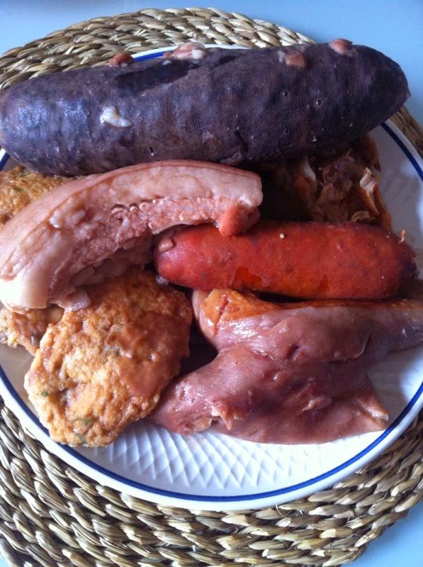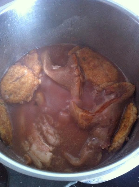 Pasados 5 minutos, añadiremos la orejas, los rellenitos, y el tocino, para cocer un poco mas, hasta que el caldo espese.