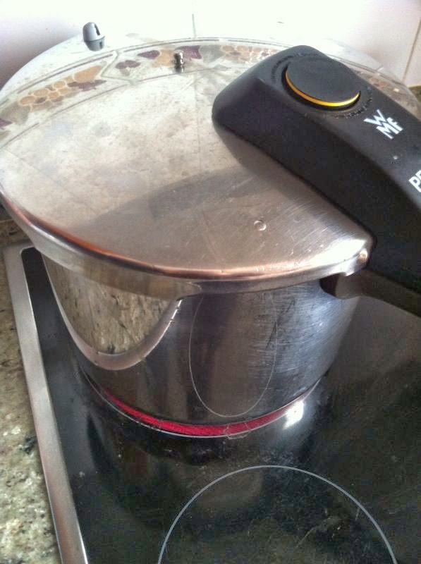 Cerraremos la olla, y la pondremos a fuego fuerte hasta que suba la válvula. Una vez este arriba, bajaremos a temperatura media y mantendremos la válvula arriba durante 40 minutos.