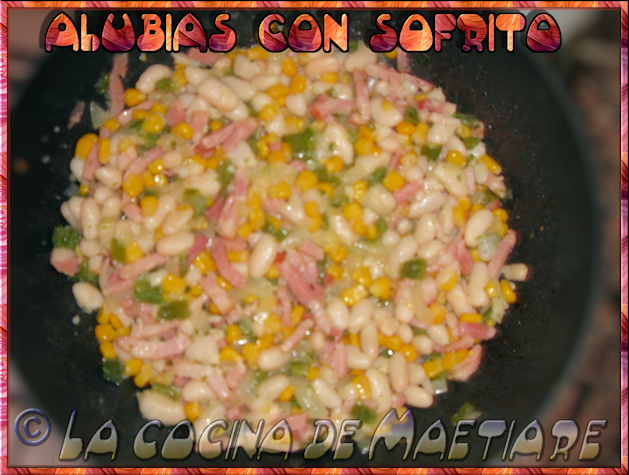 Por último añadir las alubias que habremos enjuagado bajo el grifo del agua corriente. Mezclar bien con el resto de los ingredientes , cocinar por 2 minutos más y retocar de sazón si fuera necesario.