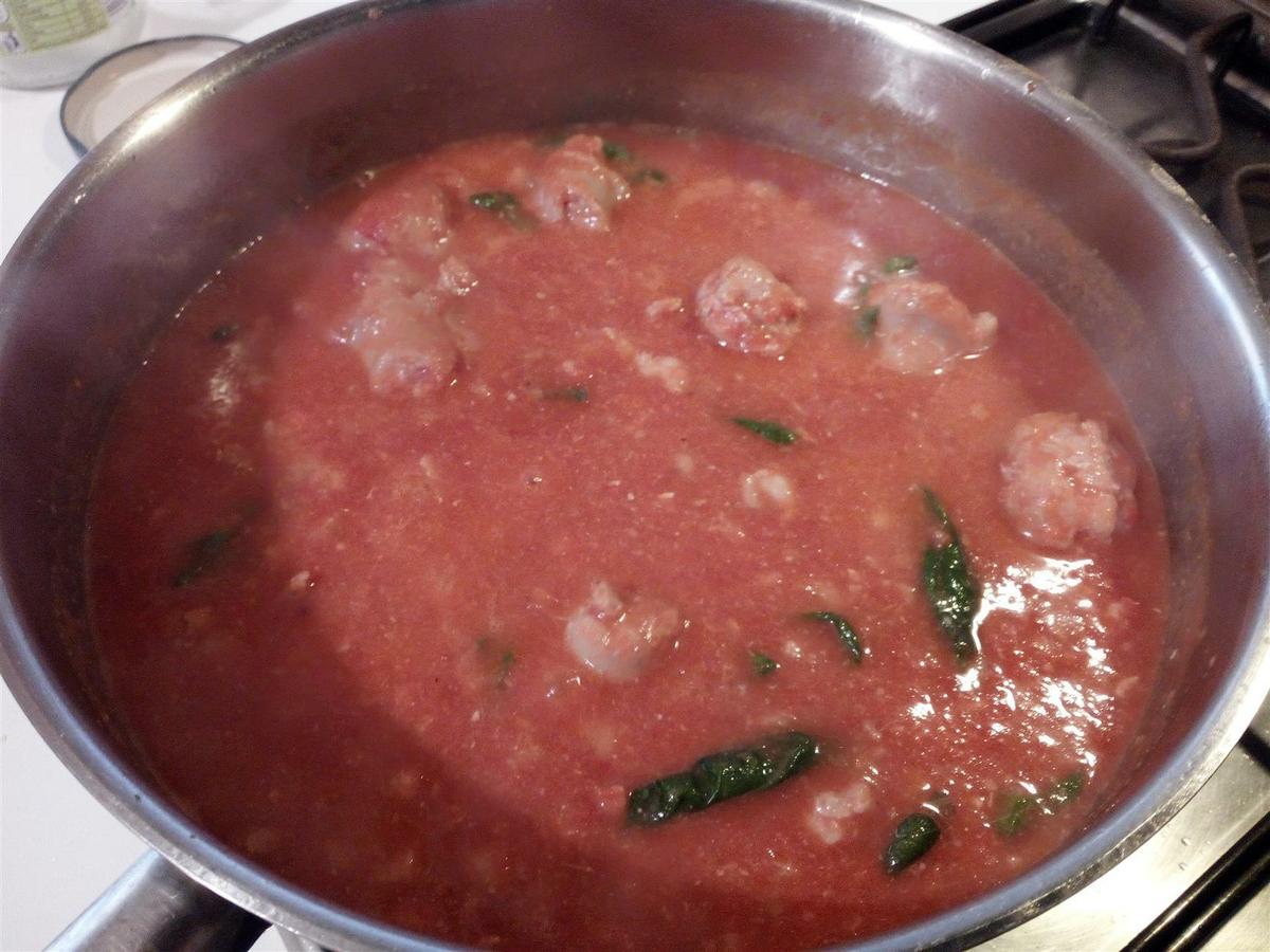 4 salchichas frescas o chorizos, 300 gr. de tomates pelados, salvia, 1-2 dientes de ajo, vino blanco y aceite EVO de Tercio de las Torres.