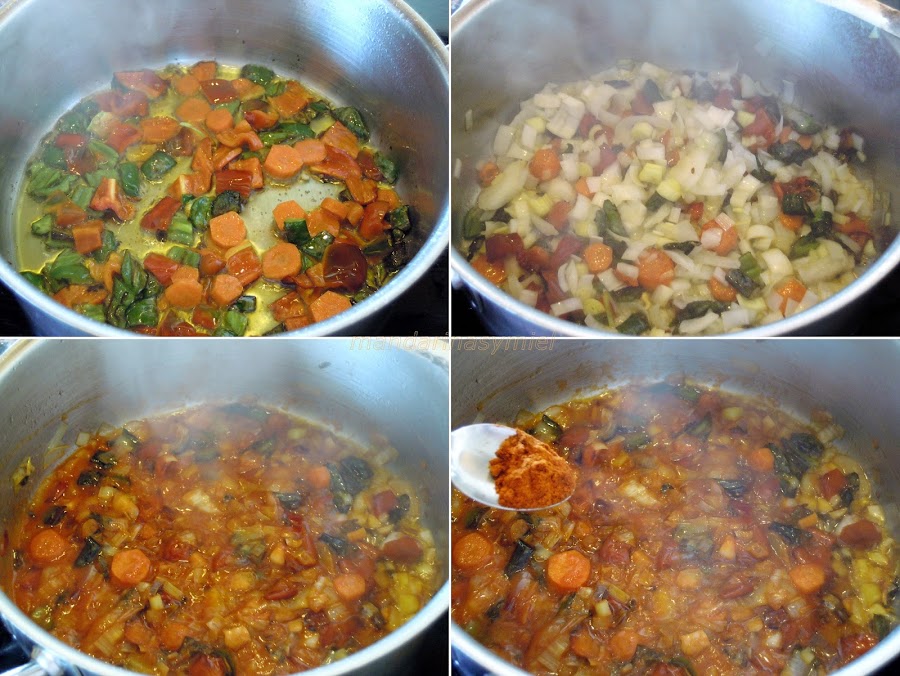 Pon aceite a calentar en una cazuela y añade las rodajitas de zanahoria y los pimientos troceados, deja que se pochen unos minutos.