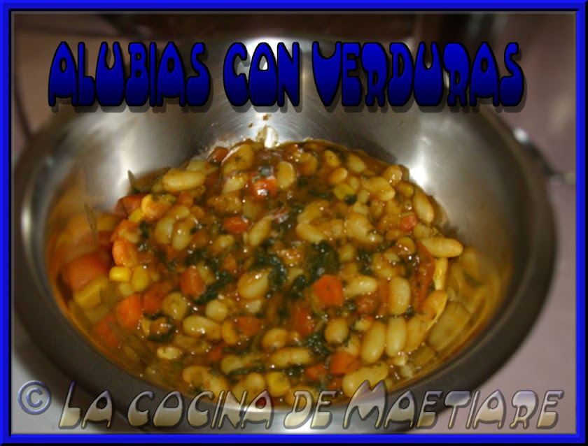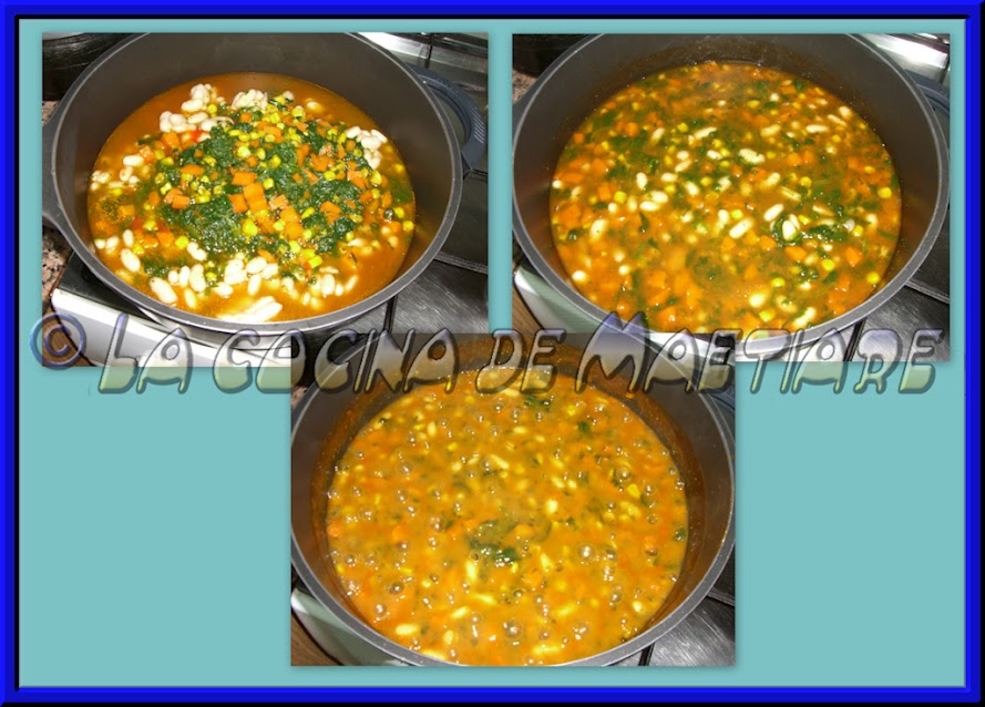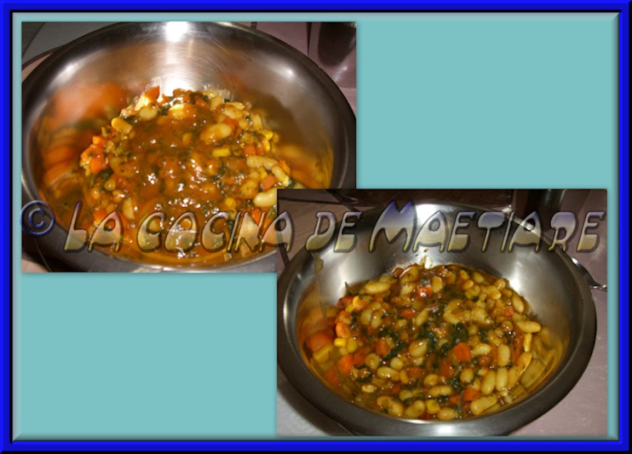 Probaremos un trozo de zanahoria y un grano de maíz para comprobar que ya estén algo cocidos pero no del todo. En ese momento añadiremos el contenido a la sartén o cacerola donde están las alubias. Mezclamos bien todo y cocinamos a fuego fuerte removiendo continuamente hasta que el líquido reduzca casí totalmente.
