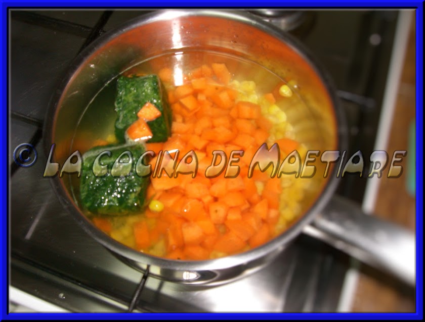 Cortamos las zanahorias en cuadritos pequeñitos (como para macedonia). Ponemos una cacerolita al fuego con el agua y añadimos las espinacas, el maíz y la zanahoria.