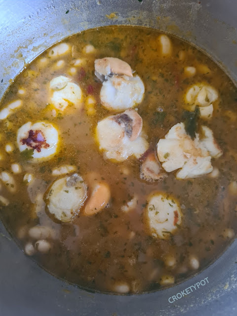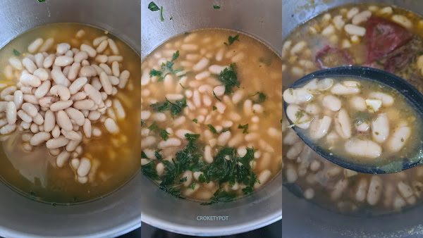 INGREDIENTES: Un bote de alubias de 400 gr., 8 vieiras, 2 ajos, perejil, 50 cc de vino blanco, caldo de pescado, un pimiento choricero, un poco de guindilla, aceite de oliva Aove y sal .ELABORACIÓN: Ponemos en la cazuela los ajos partidos con aceite de oliva y el pimiento choricero abierto por la mitad, sin pepitas.