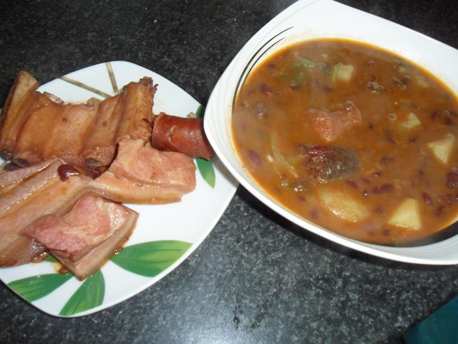 4º - Cocemos la berza en otra olla junto con el tocino , la costilla , el chorizo , la oreja de cerdo , las patatas troceadas y la sal . Una vez cocido todo , lo reservamos en un plato .