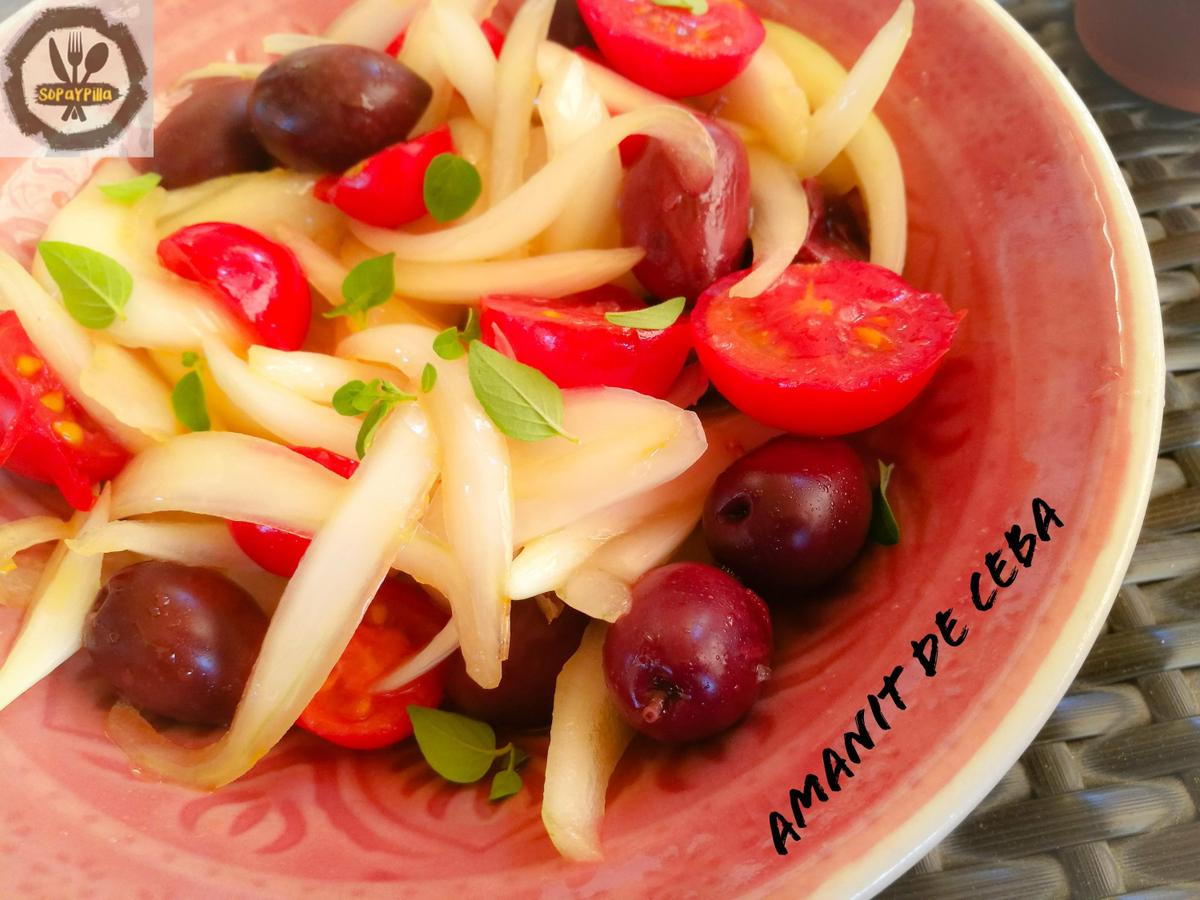 Una ensalada típica de Andorra, aunque la original no lleva tomates. Yo le añadí estos cherrys acabados de coger de la tomatera, que estaban buenísimos y unas hojitas de orégano fresco. El resultado es una ensalada espectacularmente buena, donde la cebolla no repite nada de nada. Garantizado!! Lo queréis comprobar?