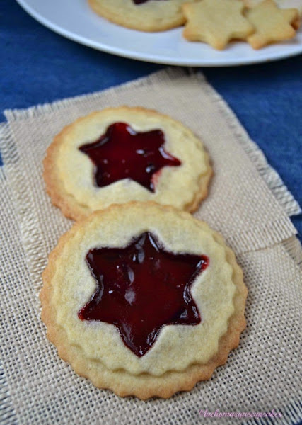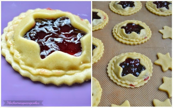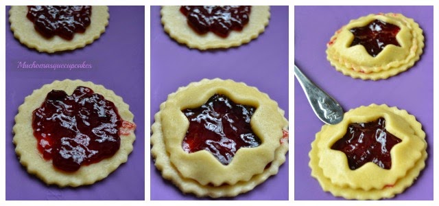 En la más grande ponemos una cucharadita de mermelada en el centro, tapamos con la más pequeña que tendrá un hueco con forma de estrella en el centro. Sellamos la masa presionando ligeramente.