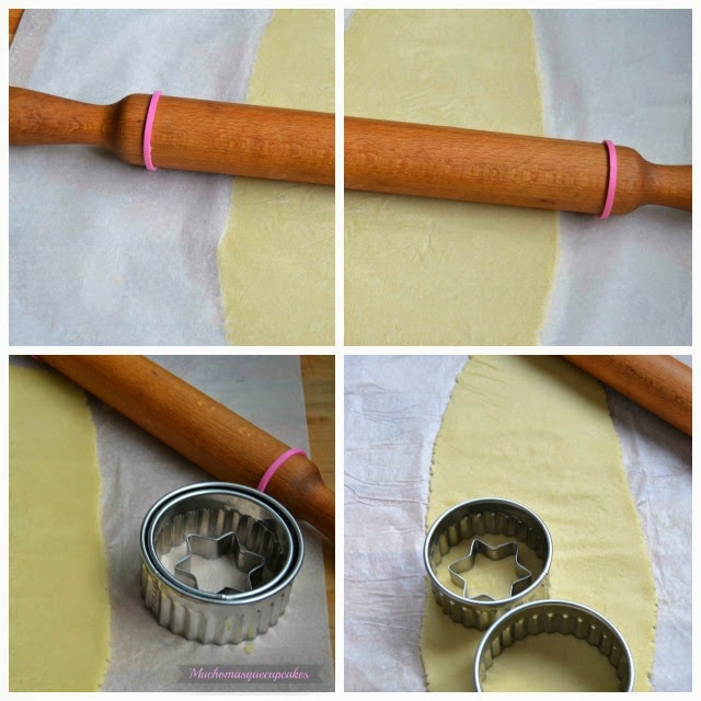 Estiramos la masa y cortamos con una galleta grande, una más pequeña y una estrella dentro de la más pequeña.