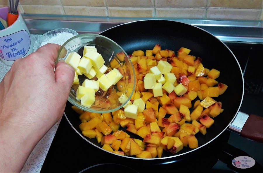 Ponemos los melocotones troceados en una sartén junto con la mantequilla y cocinamos, a fuego medio, hasta que ablanden un poco.